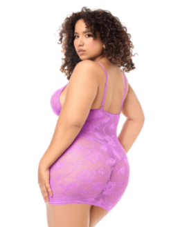 Cette nuisette grande taille allie dentelle délicate et résille transparente dans des tons lavande et chair pour une silhouette élégante et confortable.