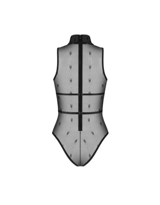 Ce body string en tulle fin sublime la silhouette avec sa broderie florale jaune et son dos nu élégamment laçé.