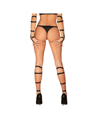 Ce harnais de corps noir, confectionné en élastiques ajustables, est sublimé par des ornements délicats, offrant une silhouette audacieuse et raffinée.