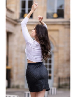 Cette jupe courte portefeuille en similicuir noir épouse délicatement la silhouette, offrant un style moderne et raffiné pour une allure affirmée.