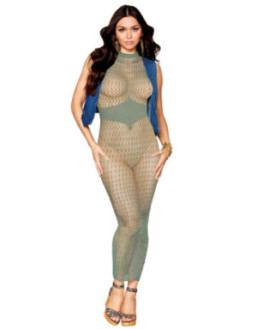 Ce bodystocking résille noir est spécialement conçu pour épouser les formes du corps avec une délicatesse incomparable. La maille fine s'adapte à chaque mouvement, créant un effet seconde peau qui allonge la silhouette et met en valeur les courbes naturelles. Son attache autour du cou, sous forme de nœud ou de collier intégré, apporte une touche de sophistication et de mystère, attirant le regard vers les épaules et le décolleté.