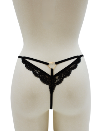 Cette culotte noire en dentelle florale, ouverte à l'entrejambe, allie audace et raffinement pour une lingerie résolument sensuelle.